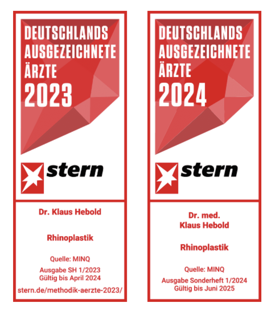 Dr. Hebold ist 2025 wie auch 2024 und 2023 zusammen mit 20 anderen Nasenchirurgen in Deutschland in einer recherchebasierten Ärzteempfehlungsliste der Wochenzeitschrift "STERN" erneut für seine Expertise in "Rhinoplastik" ausgezeichnet worden. Für diese Auszeichnung haben wir weder uns beworben, noch finanzielle Mittel eingesetzt. Nach Erscheinen der Sonderausgabe haben wir das Recht erworben, das Siegel nutzen zu dürfen. Dr.Hebold deckt die Nasenchirurgie in der Forum Klinik exklusiv ab.